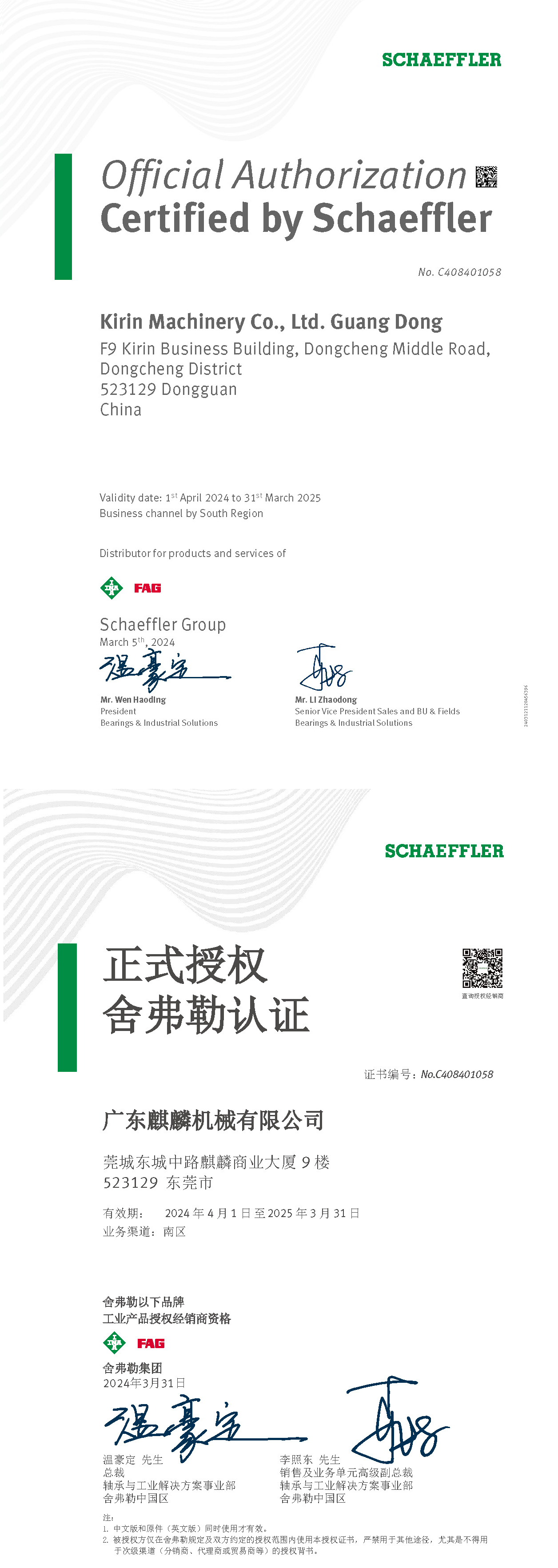 德国舍弗勒集团(INA/FAG/LUK)授权证书